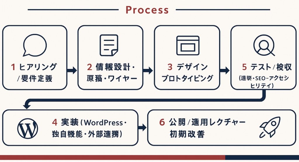 ご相談〜要件定義〜設計〜実装〜公開〜運用まで、専任の担当が伴走。小さな修正から大規模改修まで継続支援します。公開後の改善提案・月次レポートにも対応可能です。